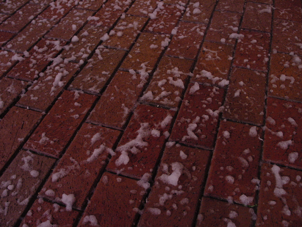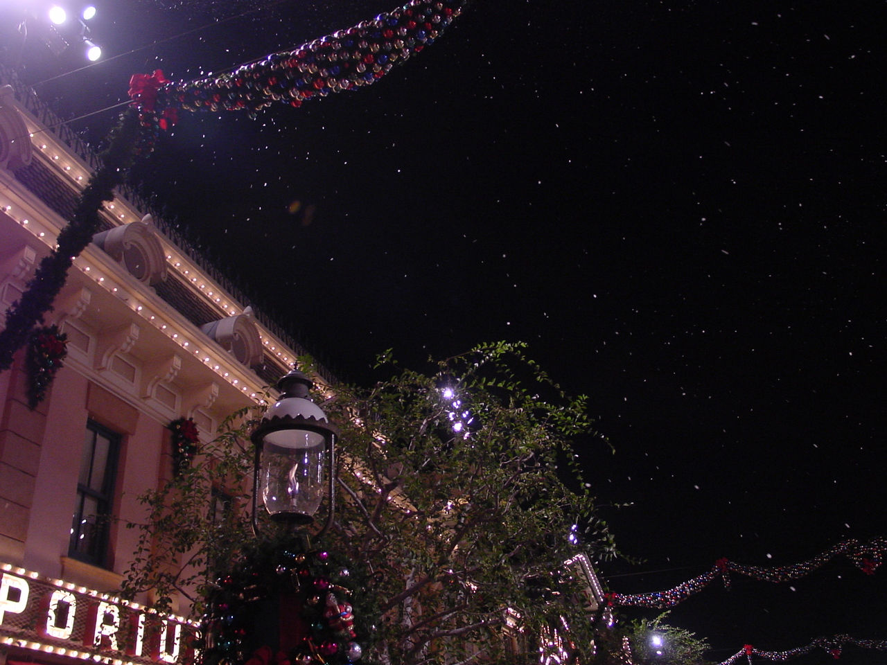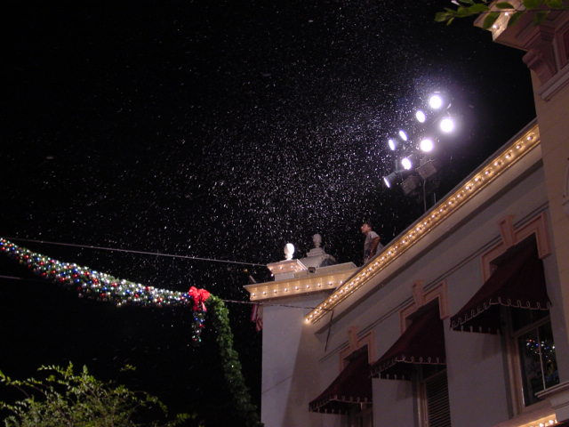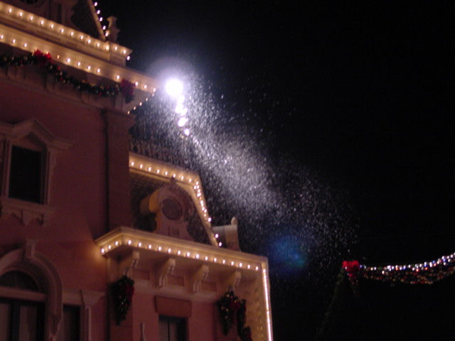 Thursday, November 2, 2000 - The "snow" is actually a light foam. One of the images on this page shows a close up of how it accumulated on the ground under one high-output snow generator thing. It floats down very much like real snow, but did seem to have a tendancy to "drift" up and through the air (which real snow doesn't, at least not here in Iowa). It also doesn't turn into gunky dirty ice sludge on the ground (it vanishes). Very cool, Disneyland! -- Al